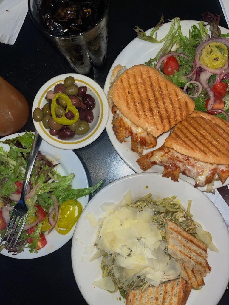 A pesto chicken pasta with focaccia bread and a chicken Parmesan sandwich with salad are served at Ted’s Most Best in Athens, Ga., on Sept. 5, 2025. The locally owned restaurant is known for its pizza, pasta and laid-back atmosphere.(Photo/Gabrielle Gruszynski)