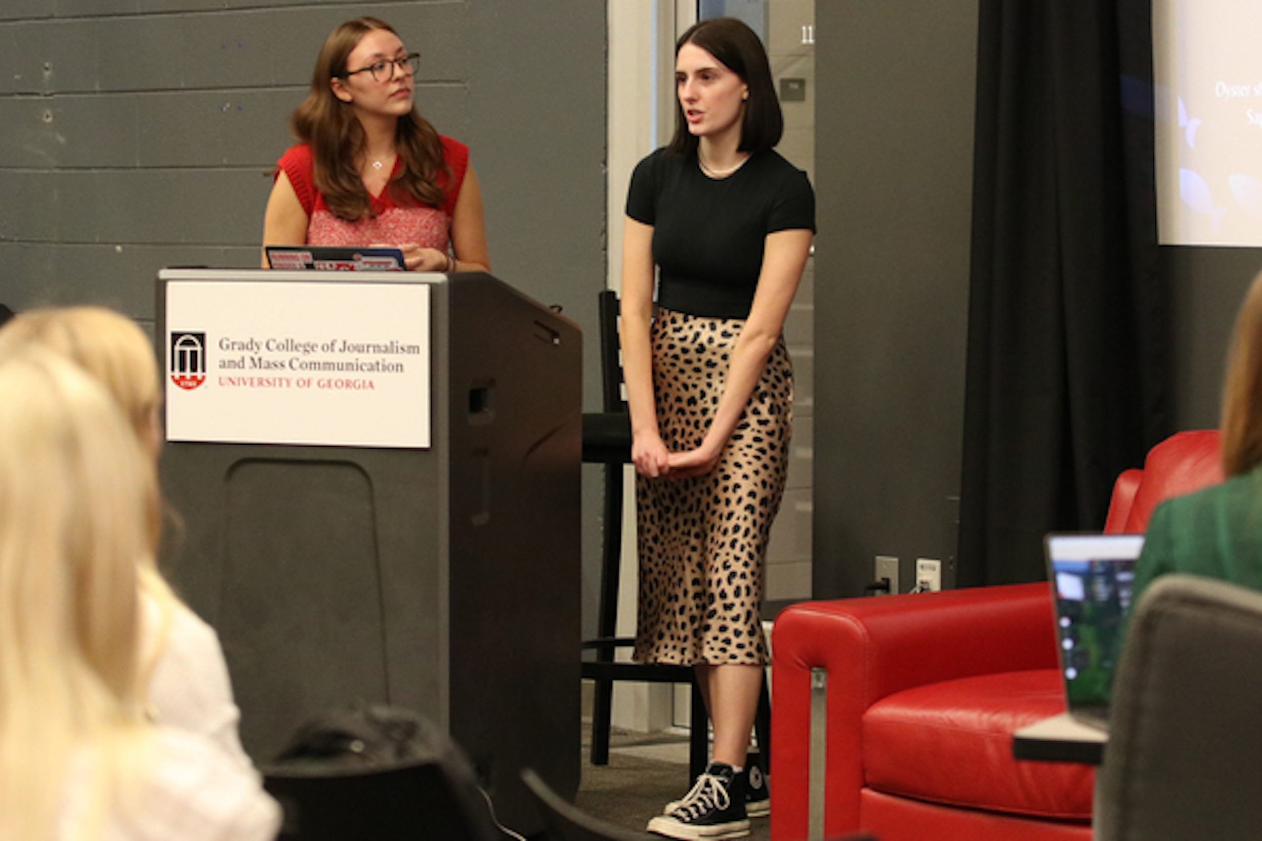 Reporting I sustainability beatmates Lily Alarcon (left) and Hannah Freeman present their story pitch on local nonprofit Shell to Shore in Studio 100 of the journalism building on April 12, 2024. The beat story pitch competition was my first experience pitching a story to professional journalists. (photo/Sarah Freeman).