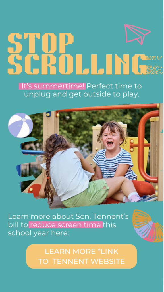 Amplification – Social media posts will be developed and deployed on Sen. Tennent’s Instagram, Facebook, and X (Twitter) accounts. Corresponding graphics will be developed to be added to the Senator’s website. Supportive quotes will be collected from intellectual experts on the benefits of limited screen time to be used on our platforms.