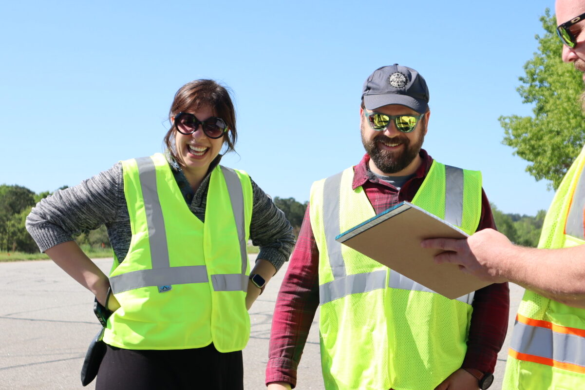 Shirelle Hallum stands in a neon safety vest, squinting through her big round sunglasses across Commerce Boulevard as a truck zips by. She’s ready to lead and ready to work — her boots on, sleeves rolled up and wispy brown hair pulled back in a velvet purple scrunchie.